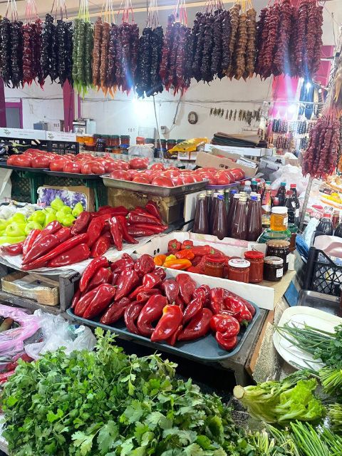 Późniejsze śniadanie. Wizyta na lokalnym bazarze Majakowskiego, podczas której można zaopatrzyć się w świeże przyprawy, suszone owoce i churchelle oraz gruzińską herbatę.